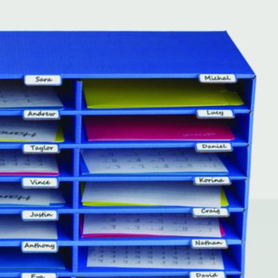 - Small label tab that hangs down for precise labeling to identify student names in the classroom or individual files or projects in the office.