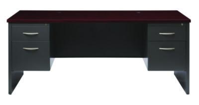 Our executive double pedestal steel desks are perfect commercial grade desks for business, educational or personal offices. These heavy-duty desks feature steel construction and are suitable for heavy use. Standard features include full extension ball-bearing drawer slides for smooth drawer action, central locking center drawer and a strong laminate wood top.