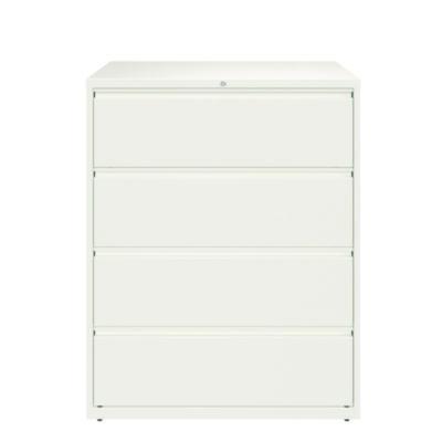Drawers with side-to-side hang rails to accommodate letter/legal hanging files. Full drawer extension on steel ball bearing telescoping slide suspension helps drawers glide with ease. Stylish, full-width radius edge recessed pulls help to quickly open and close drawers. Anti-tipping interlock system allows only one drawer to open at a time. Single key core removable lock with two keys. Four adjustable leveling glides. Durable powder coated finish helps prevent scratches.