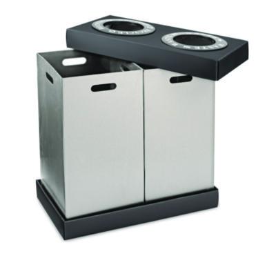 • The separate bins fit into a single base and are covered by a single lid, holding garbage bags in place while delivering a clean, polished look.