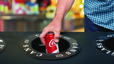 Recycling bin features labels for glass, paper, recyclables, cans and waste.