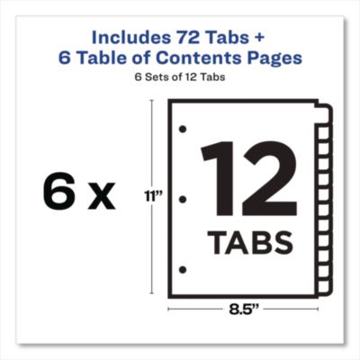Avery Customizable TOC Ready Index Multicolor Tab Dividers, 12-Tab, 1 to 12, 11 x 8.5, White, Traditional Color Tabs, 6 Sets (AVE11196)