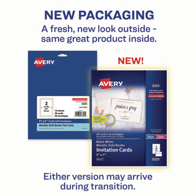 Avery Invitation Cards with Metallic Border, Inkjet/Laser, 80 lb, 5 x 7, Matte White, 2 Cards/Sheet, 15 Sheets/Pack (AVE3325)