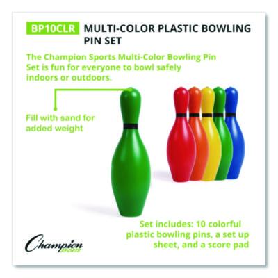 Champion Sports Plastic Bowling Pin Set, Assorted Colors, 10/Set (CSIBP10CLR)