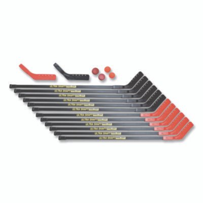 - Includes 12 sticks (six black and six red); two no bounce balls (orange); two pucks (red); and two extra blades (red and black).